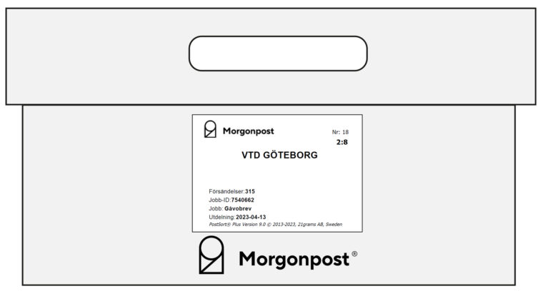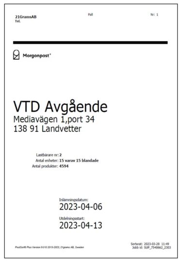 Det kommer att skapas en palletikett för varje utdelningsbolag. Lägg respektive palletikett tillsammans med utdelningsbolagets Morgonpost-lådor.